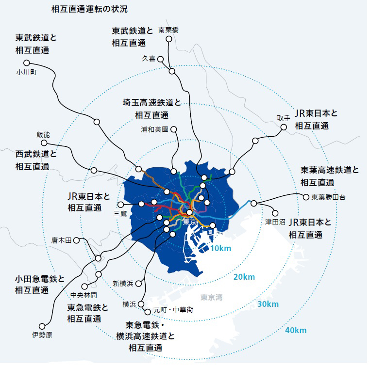 当社路線は数多くの他社線と相互直通運転を行っており、総路線距離は556.6㎞(直通運転を含む)にも及びます。そのネットワークの中心を担うのが日本の政治・経済・文化の中心地である東京の地下を網目状に走る東京メトロです。