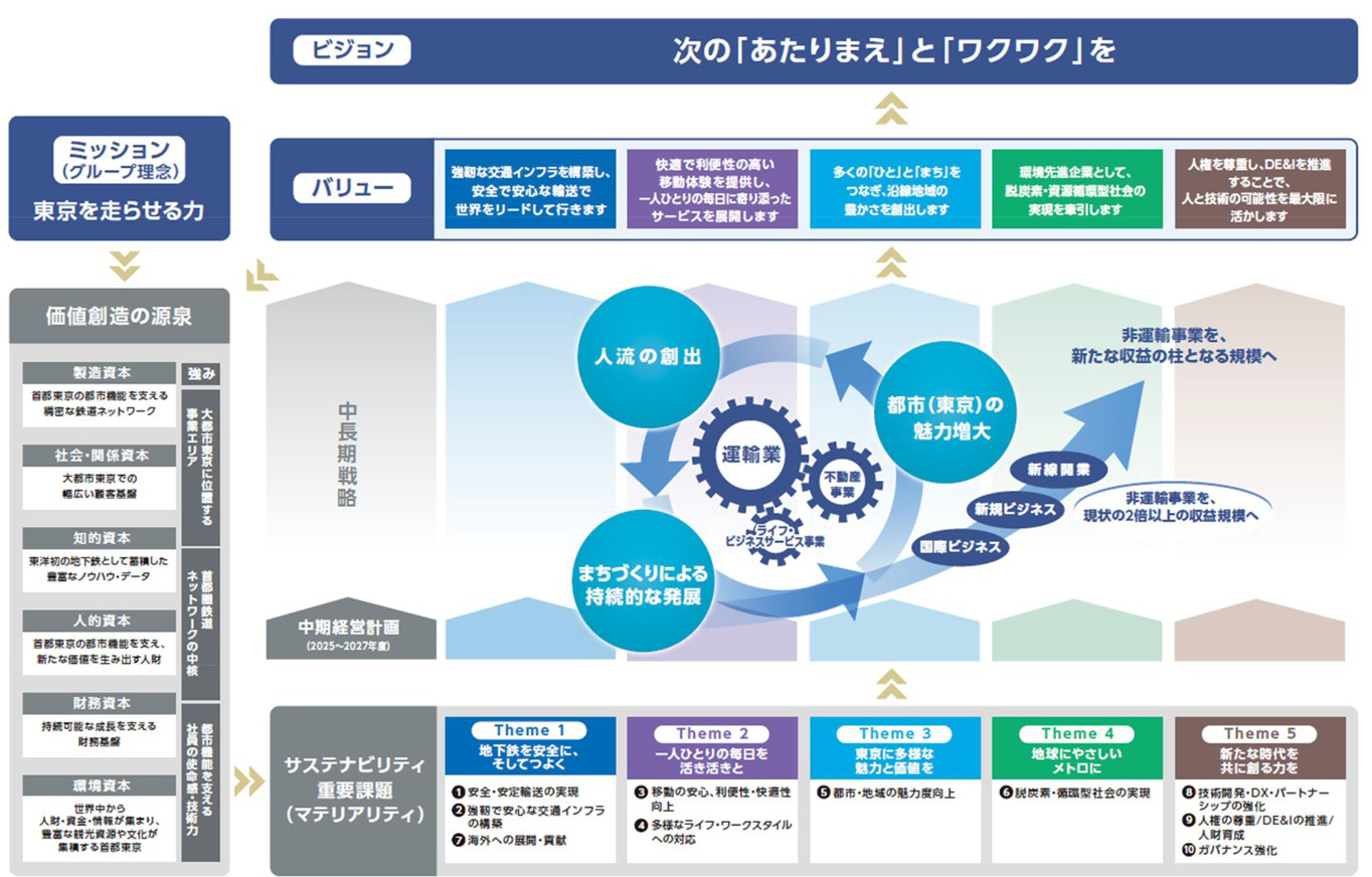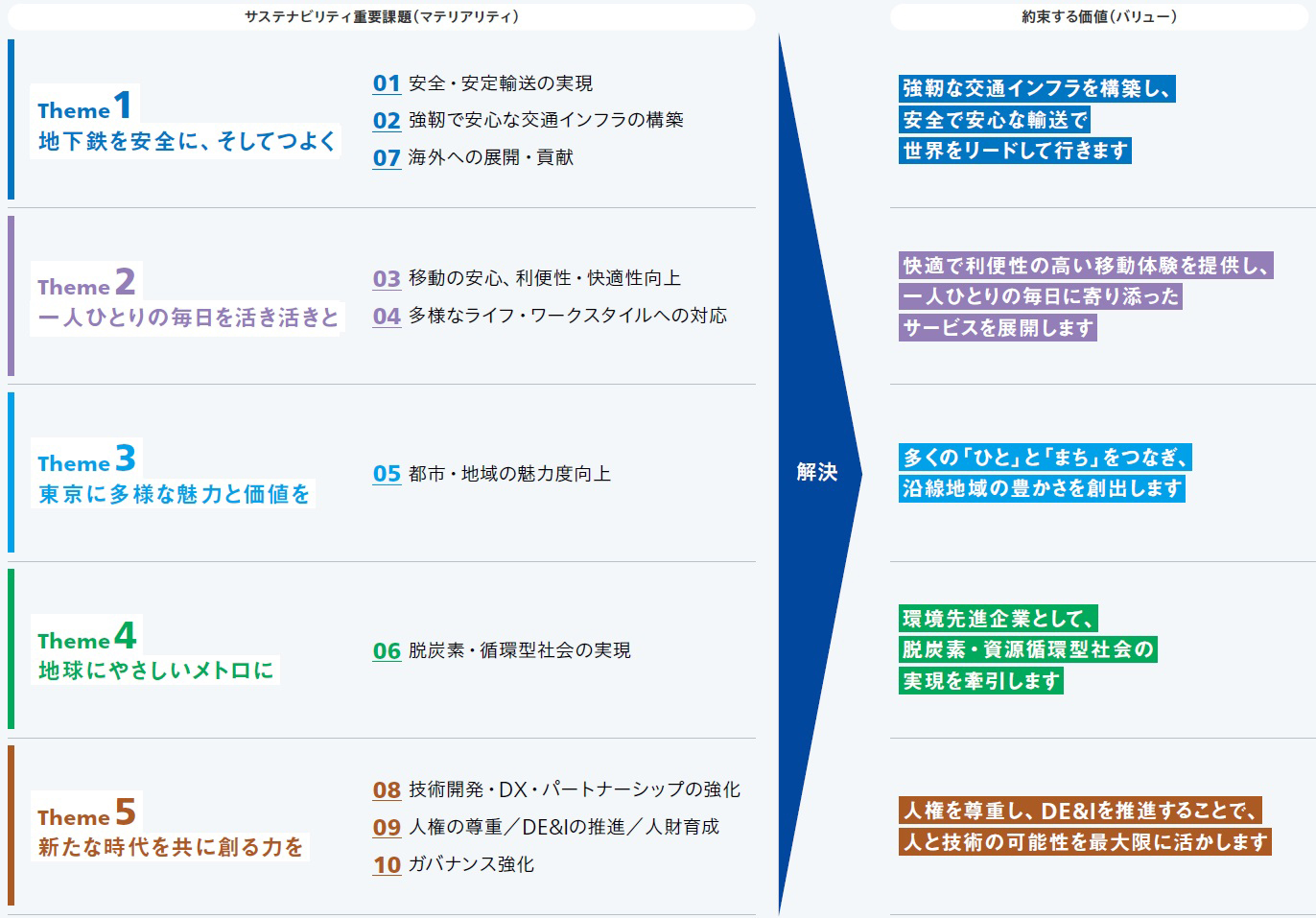 東京メトログループがサステナビリティ重要課題(マテリアリティ)を解決することにより約束する価値を「バリュー」として、以下のように定義しています。