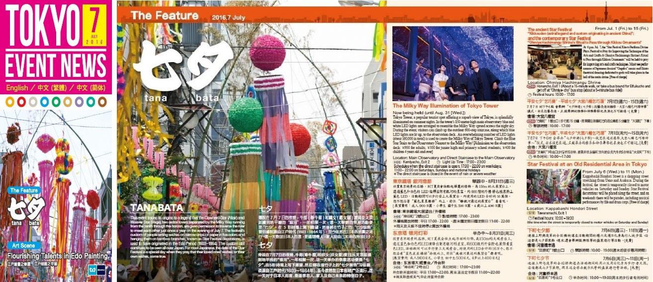 7月号(2016年6月30日发行)的"TOKYO EVENT NEWS"主要介绍七夕节,以及各种庆典、展览会、戏剧、花展等不同日期举办的25个活动。