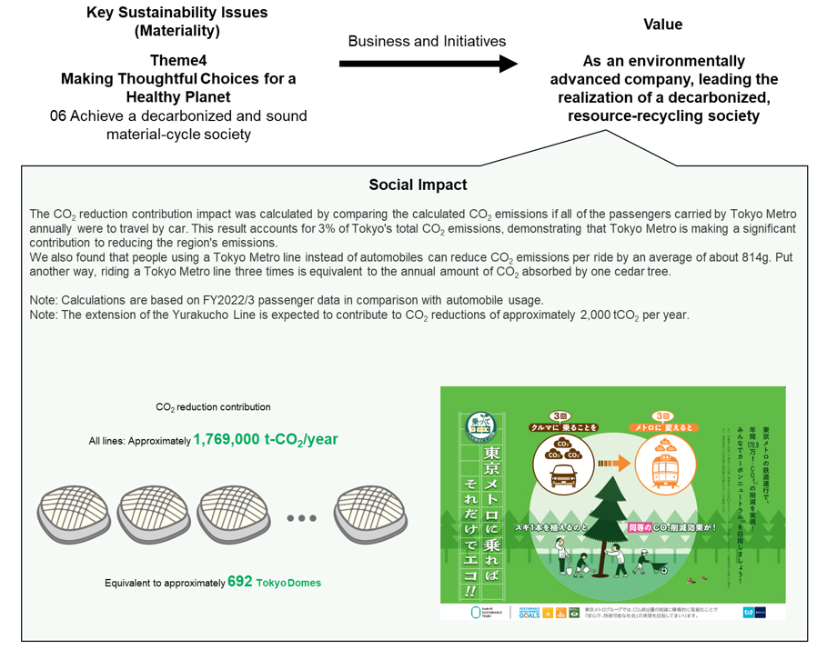 Focusing on the fact that Tokyo Metro is an environmentally-friendly means of transportation, we calculated the impact from an environmental perspective.