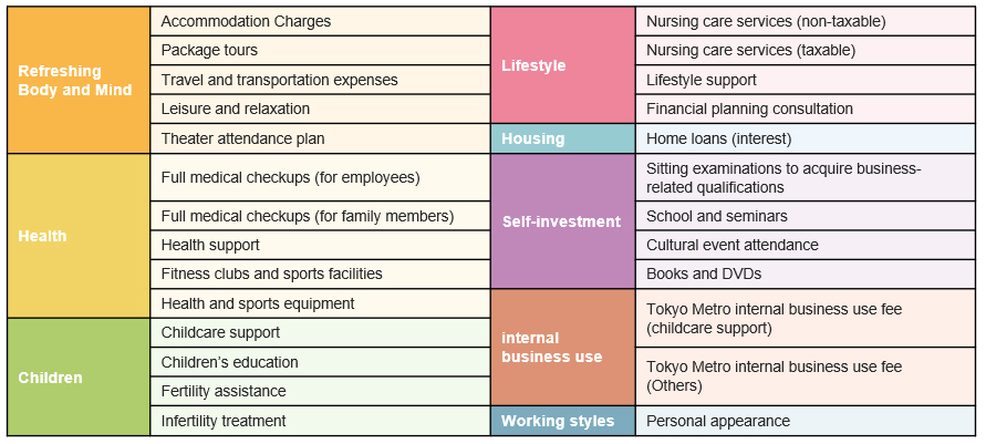 We provide a Cafeteria Plan in which employees are given points every year and can use the points to choose from a range of benefit programs that suit their lifestyle and needs, such as travel, entertainment, and child-raising support.