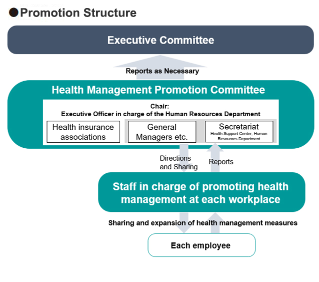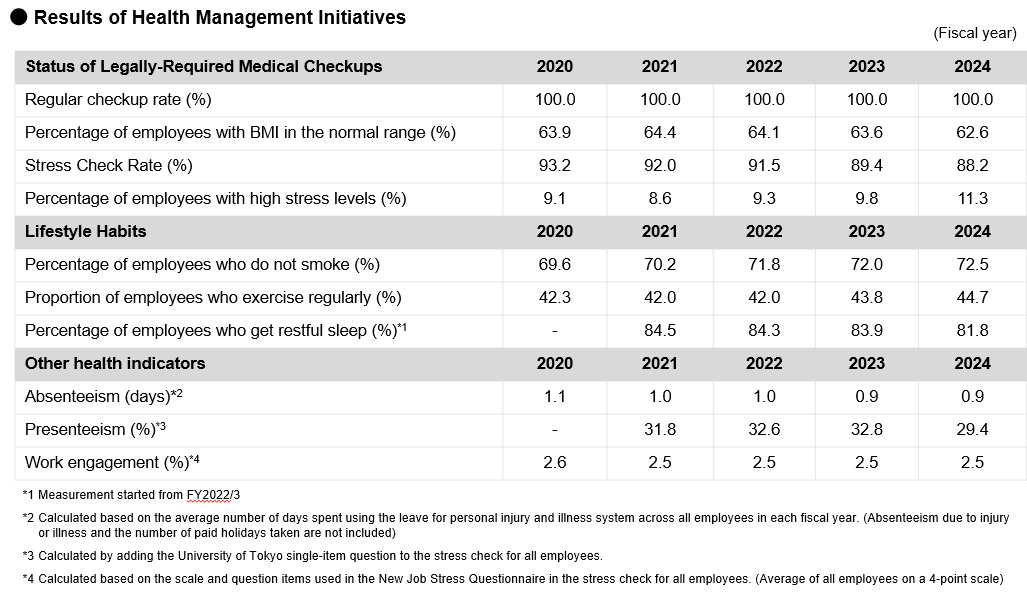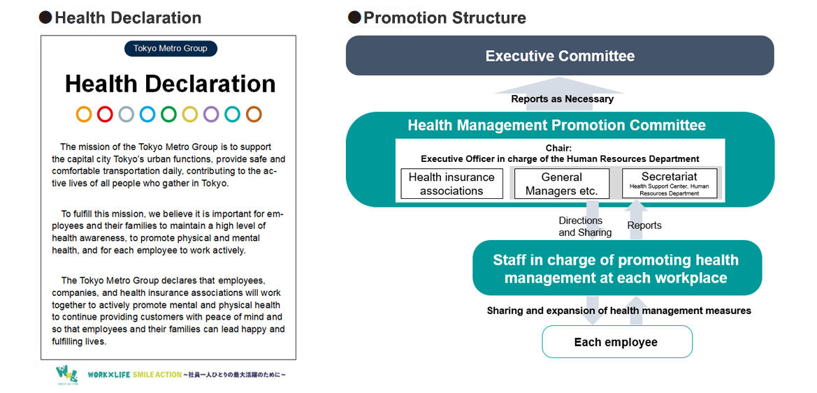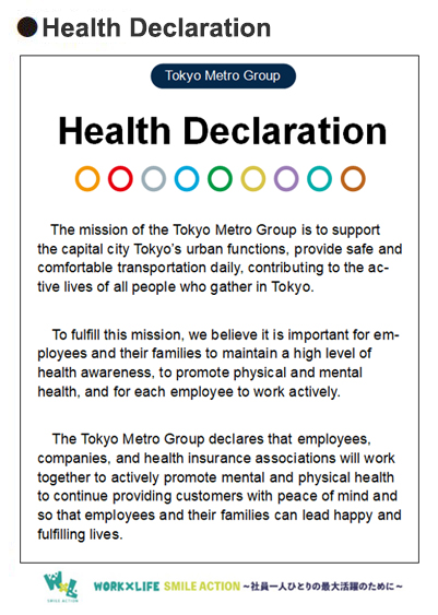 We support the mental and physical health of our employees and their families, which is the bedrock of on-the-job motivation for all employees. The Health Management Promotion Committee, chaired by the executive officer in charge of the Human Resources Department, sets numerical targets for key initiatives (such as smoking cessation, exercise, and sleep) to ensure that health issues are addressed, and it plans and organizes health promotion activities. In addition, based on the Tokyo Metro Group Health Declaration, Tokyo Metro Group employees, companies, and health insurance associations work together to actively promote mental and physical health to continue providing customers with peace of mind and so that employees and their families can lead happy and fulfilling lives. As a result of our efforts to create a workplace where employees can work with healthy minds and bodies, we were certified as a Certified Health & Productivity Management Outstanding Organization (large enterprise category) in March 2025, recognizing us as a company that practices excellent health and productivity management.