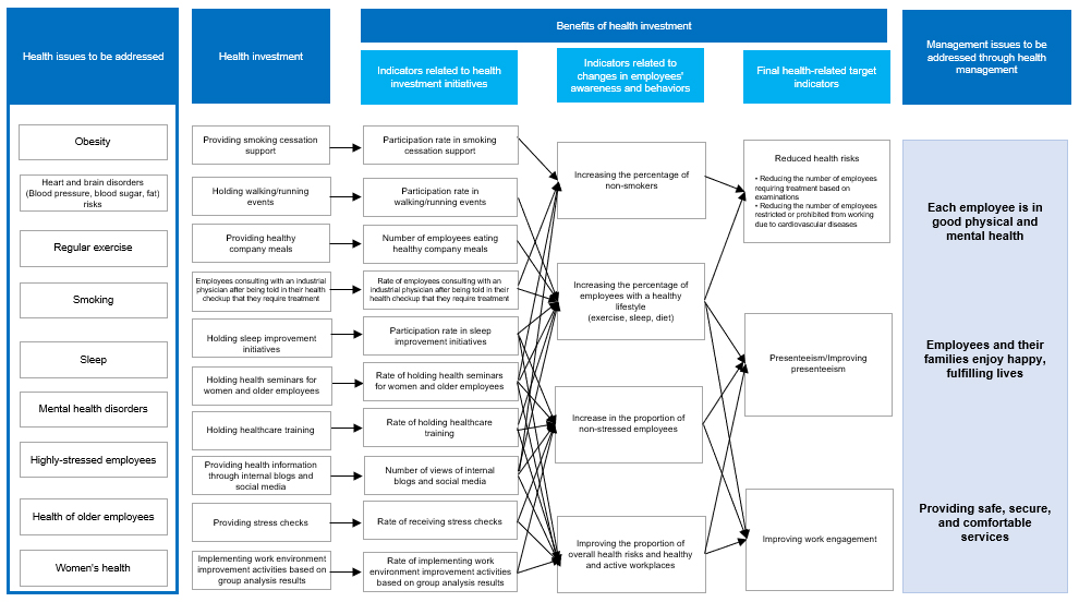 In order to address the lifestyle-related diseases, mental health, illnesses caused by smoking, and health issues by segment (such as gender and age group) which are health issues at Tokyo Metro - as well as to prevent disease from occurring - we promote organized initiatives focusing on diet, exercise, sleep, stress, and smoking, and encourage each and every employee to actively participate in health promotion.