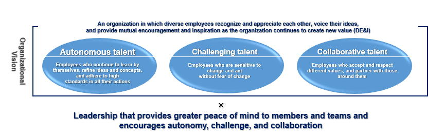 For personnel to embody the "Ideal Employee," leaders need to provide greater peace of mind to members and teams and encourage their qualities of autonomy, challenge, and collaboration. The reason for this is that when members and teams have greater peace of mind, they feel more comfortable about expressing their opinions and acting without fear of the reactions of those around them. To achieve this, we will first base our work on providing greater peace of mind, and then support employees in embodying autonomy, challenge, and collaboration. This type of leadership is essential to achieving DE&I in individual organizations, and we believe that it will promote members' capacity for autonomy, challenge, and collaboration, and creating results through teamwork.