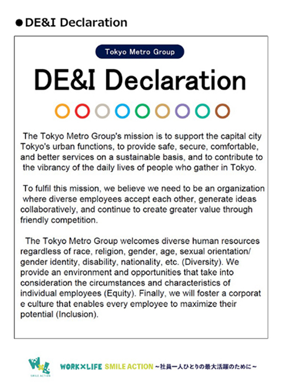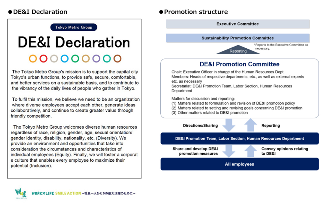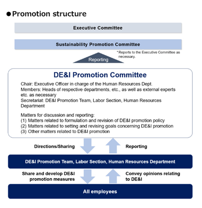 We will continue to promote DE&I to achieve our organizational vision. To meet the diverse needs of our customers and secure human resources, we welcome diverse talent into our organization and provide an environment and opportunities that take into consideration the circumstances and characteristics of each individual employee, thereby fostering a corporate culture in which all employees can maximize their capabilities. Such a culture will improve engagement and innovation and lead to the creation of new value. In May 2023 we established a DE&I Promotion Committee, chaired by the executive officer in charge of the Human Resources Department, to provide a forum for discussing and reporting matters related to the promotion of DE&I. In August that year, we formulated our DE&I Declaration to accelerate various initiatives to promote DE&I, including the active participation of women.