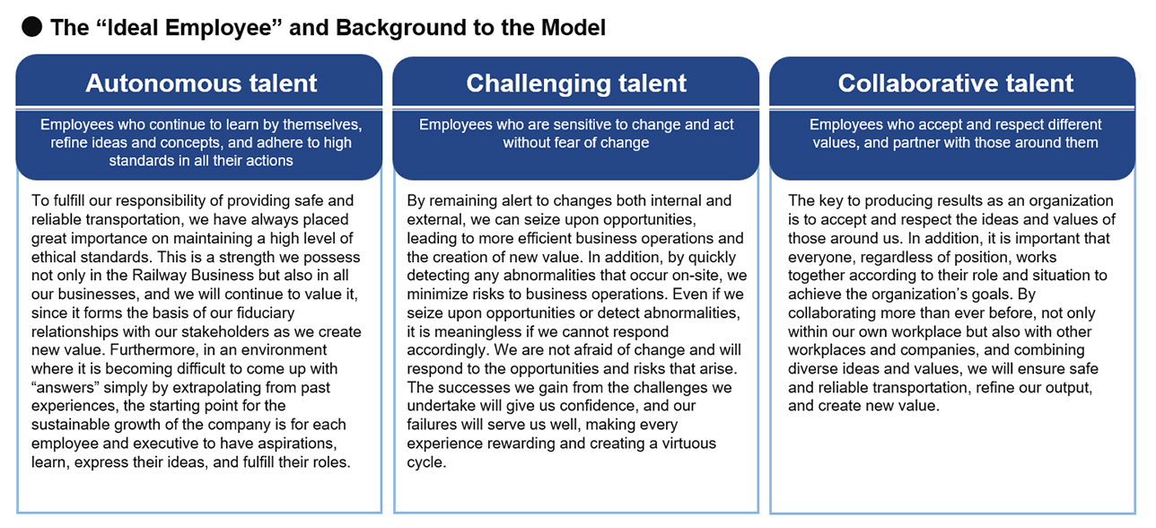 In promoting human capital management, we have defined our "Ideal Employee" (one that embodies "autonomy," "challenge," and "collaboration"). This definition clarifies the type of personnel needed to realize our management strategy and it is at the core of our human resources strategy.