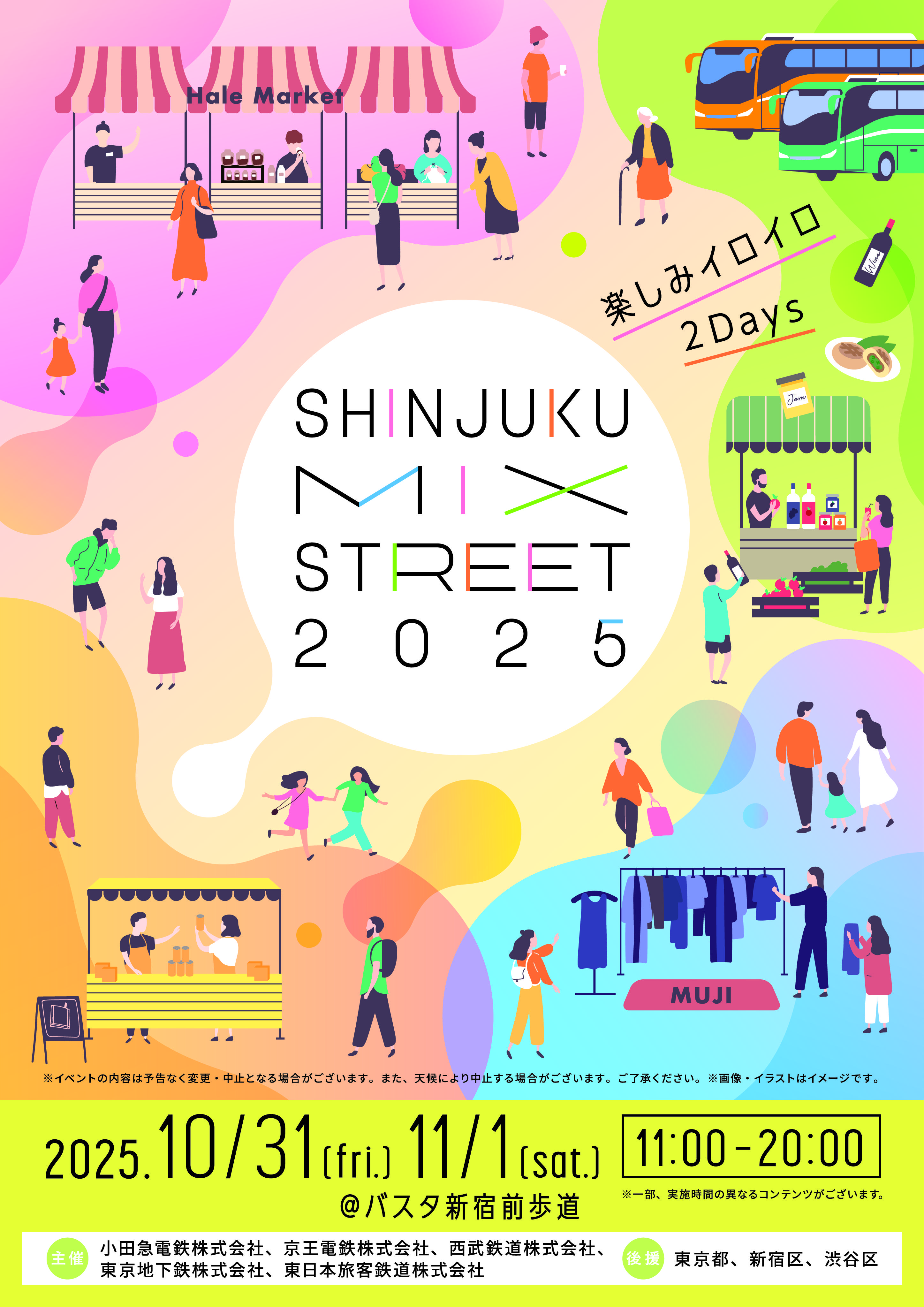 小田急電鉄株式会社、京王電鉄株式会社、西武鉄道株式会社、東京地下鉄株式会社、東日本旅客鉄道株式会社が共同して、2025年10月31日(金)、11月1日(土)に、甲州街道(バスタ新宿前)歩道にて、公共空間等を活用した賑わいの創出を目指す「SHINJUKU MIX STREET 2025」を開催します。