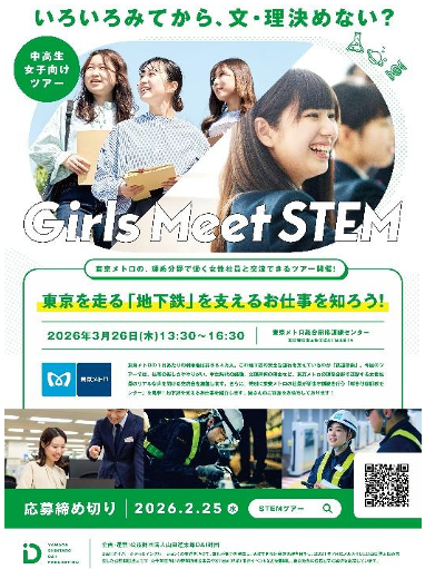 東京地下鉄株式会社(本社:東京都台東区、代表取締役社長:小坂 彰洋、以下「東京メトロ」)は、公益財団法人山田進太郎D&I財団(所在地:東京都港区、代表理事:山田 進太郎)が展開する中高生女子向けSTEM※1(理系)領域のツアー型体験プログラム「Girls Meet STEM」に参画します。