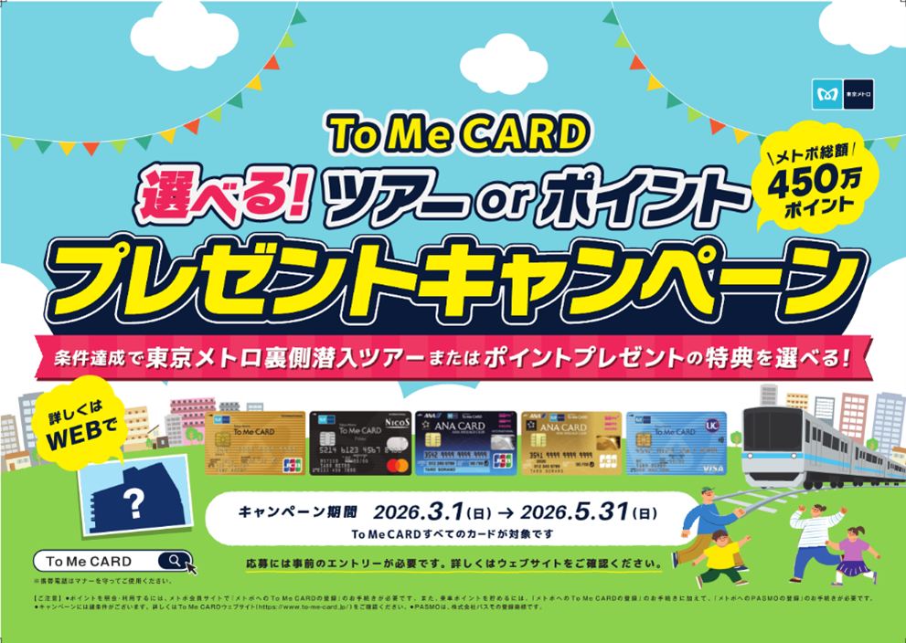 東京地下鉄株式会社(本社:東京都台東区、代表取締役社長:小坂 彰洋、以下「東京メトロ」)、は、To Me CARD会員を対象に2026年3月1日(日)~5月31日(日)の期間において、「選べる!ツアーorポイント プレゼントキャンペーン」を実施いたします。