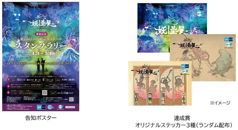 このスタンプラリーでは、東京メトロの対象3駅(溜池山王駅、錦糸町駅、王子駅)及び東京モノレールの対象1駅(天王洲アイル駅)を巡り、4匹の妖怪をモチーフにしたオリジナルスタンプをすべて集めていただくと、達成賞として先着9,000名様に"オリジナルステッカー"をプレゼントします。